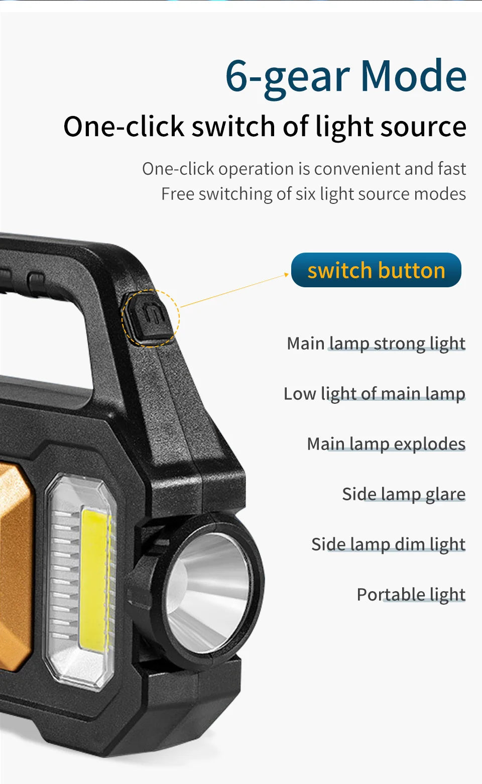 Lighting gear: 6 gears, main light strong light - main light weak light - main light flashing - metering strong light - metering weak light - flashlight strong light